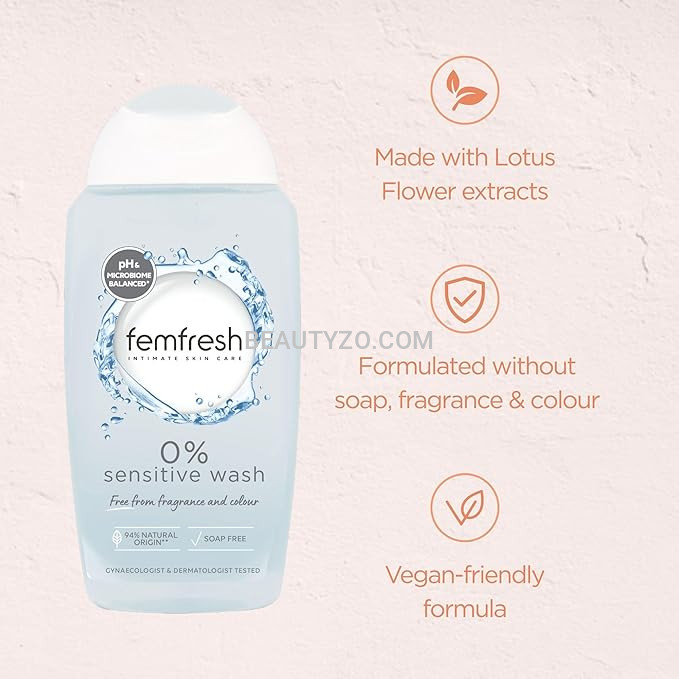 Perfect for everyday use, Femfresh 0% Sensitive Wash keeps you feeling fresh, clean, and confident all day longwithout compromising your skin’s natural balance.